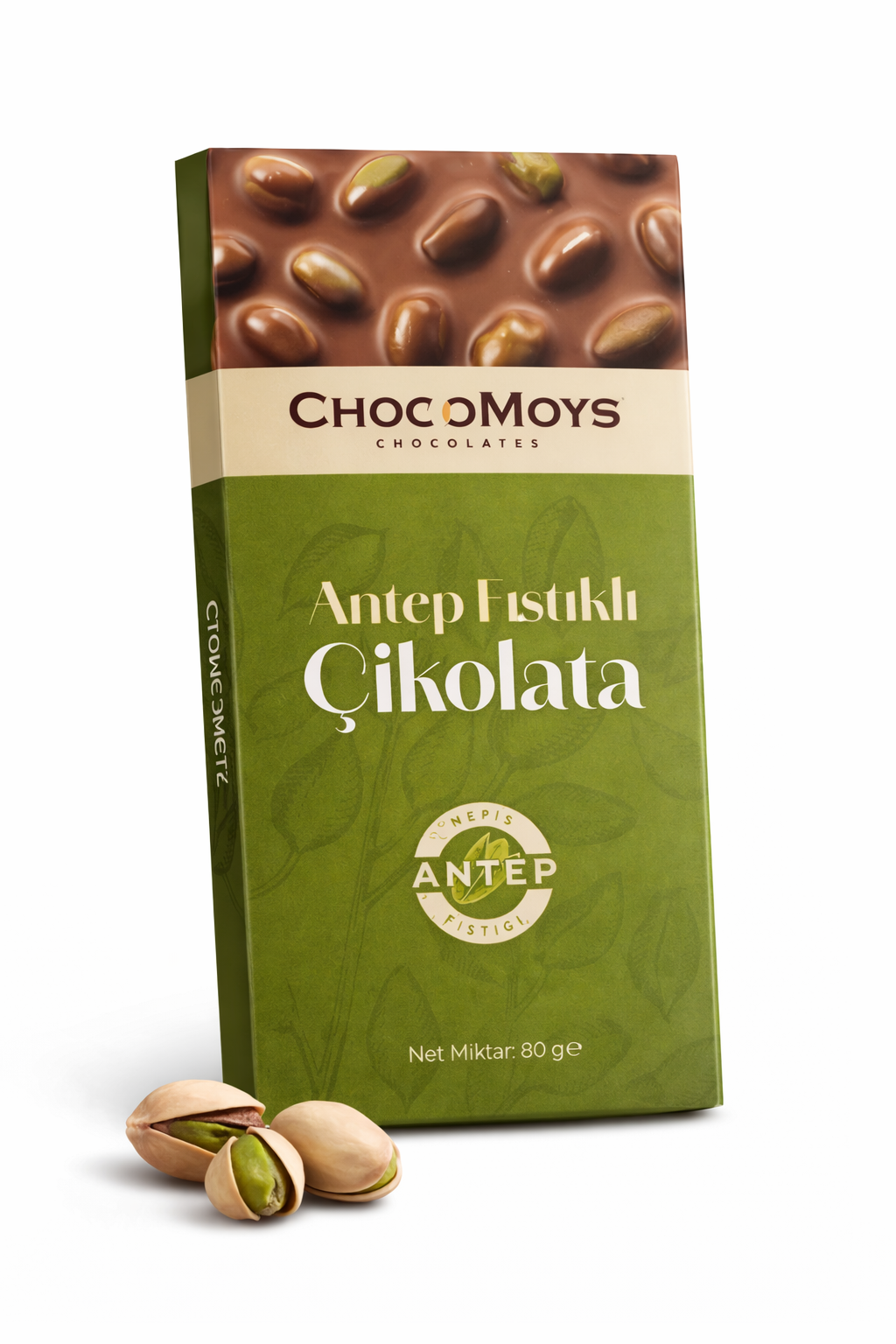 ChocoMoys Antep Fıstıklı Tablet Çikolata, %40 kakao oranıyla yoğun çikolata aromasını Antep fıstığının kendine has lezzetiyle buluşturur. Her karede bütün Antep fıstıkları ve İsviçre usulü üretim kalitesi sizi karşılar.